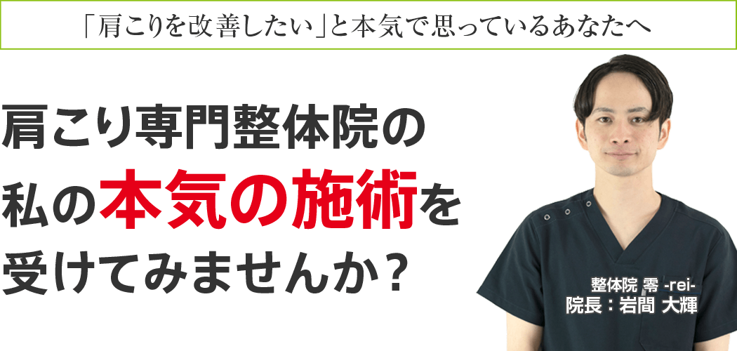 もしあなたが今、上記のようなお悩みを抱え、ほんの少しでも⼼のどこかで良くなりたい!と思われているなら、整体院 零-REI-に来院し、そのつらい慢性肩こりを根本から改善しませんか?