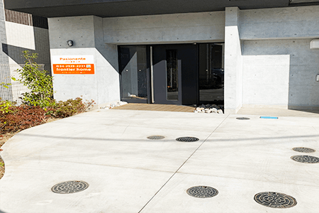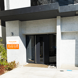 65番の裏口から入っていただき反対側に回っていただくと正面玄関がございます。正面玄関のインターホンから302号室の呼び出しを宜しくお願い致します。