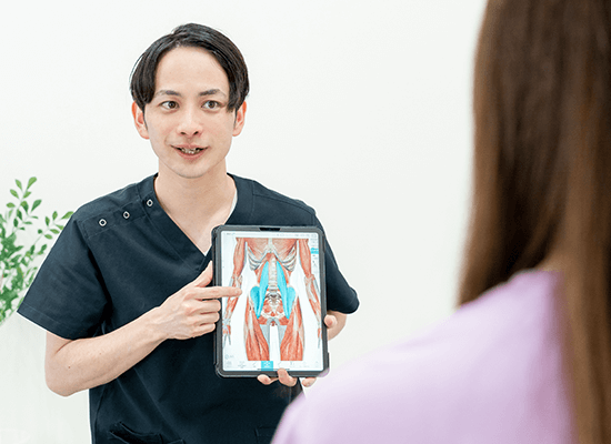 相談などトータル的なサポートを受け根本的な改善を⽬指し、⼀⽣痛みのない⽣活をおくる道