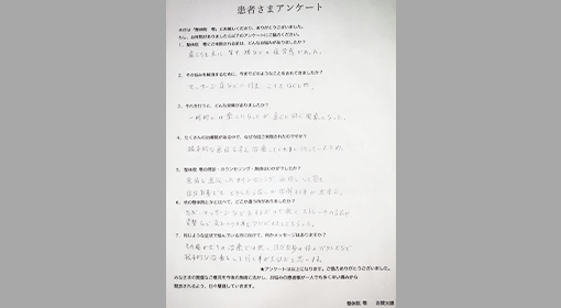 私が行ったたくさんの治療院との大きな違いは問診・カウンセリング・セルフケアでした。 問診・カウンセリングに約1時間の時間をかけてしっかりと検査していただき、色々な場面から痛みの原因を 探し出していただいたのは初めてでした。セルフケアについてはたくさんの種類を教えていただき それを行うことによって自分の力で痛みをなくす感覚を知りました。